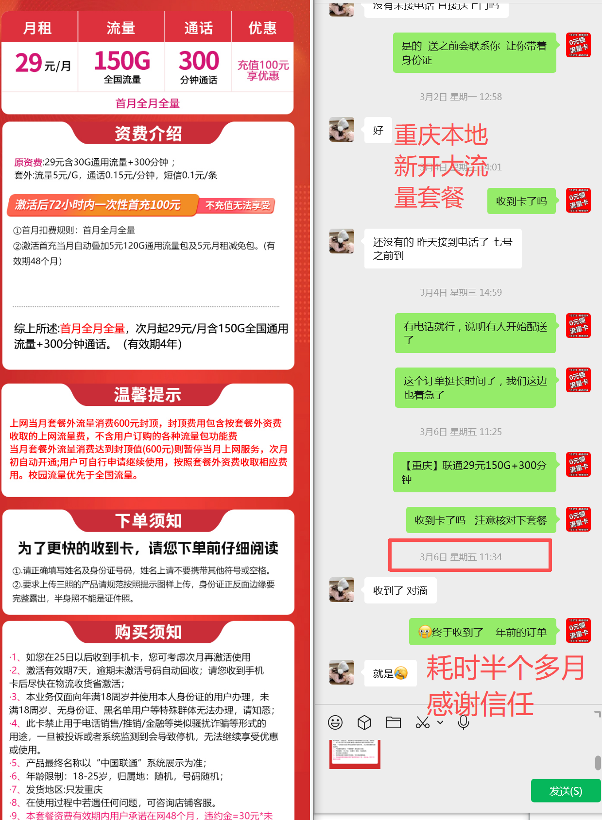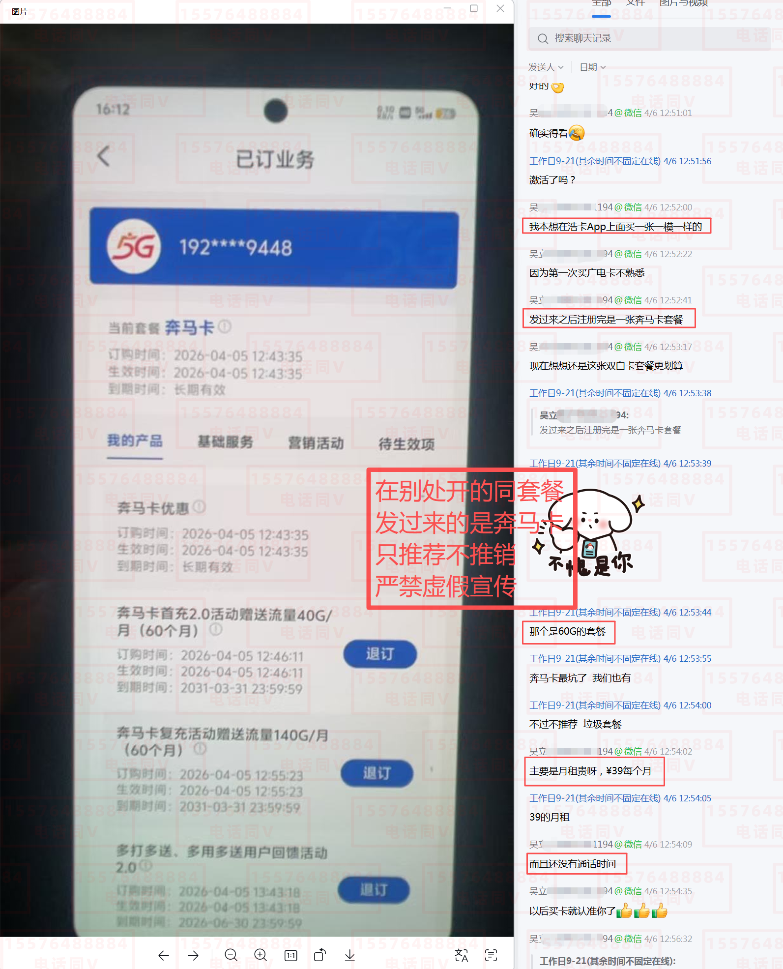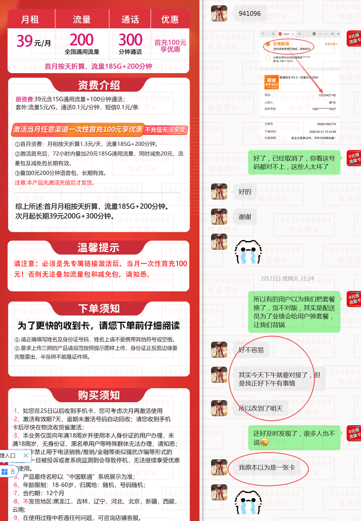 激活时一定要核对套餐,查一查流量通话够不够,部分代理商会虚假宣传,个别配送员会给用户改套餐,虚假宣传套餐不符这锅我们不背!
